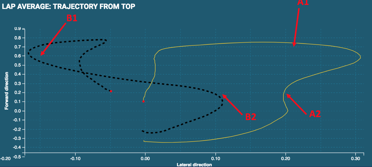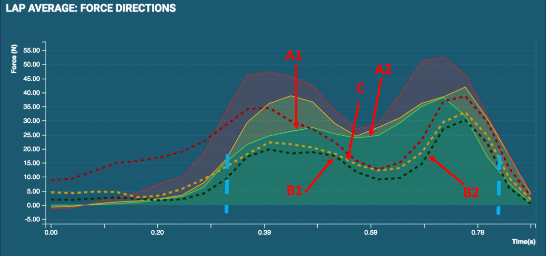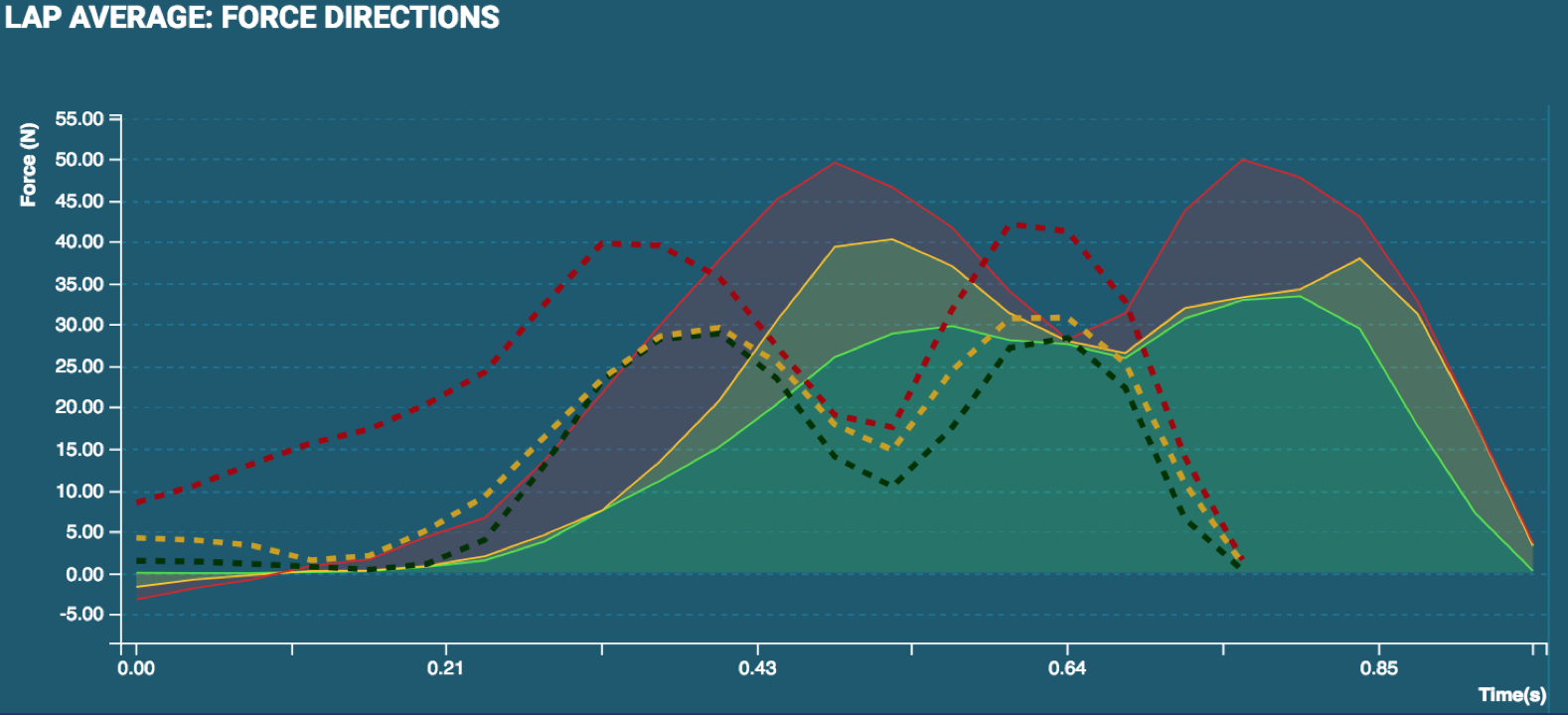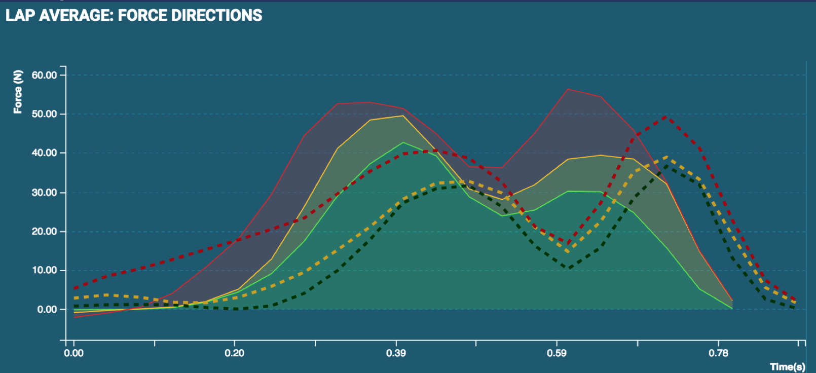 Resultatet blev att Anna kom över 40N i framåtdrivande kraft på höger arm som är hennes dominanta sida, och ökade dessutom en hel del på vänster sida. Dessutom lyckas Anna nu generera framåtdrivande kraft mycket tidigare i armtaget (se grön kurva i diagrammen ovan)