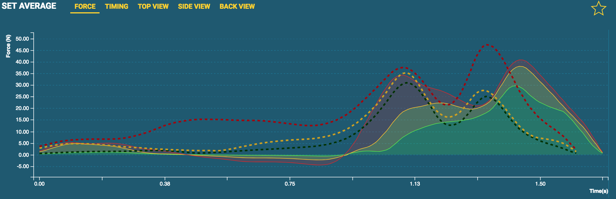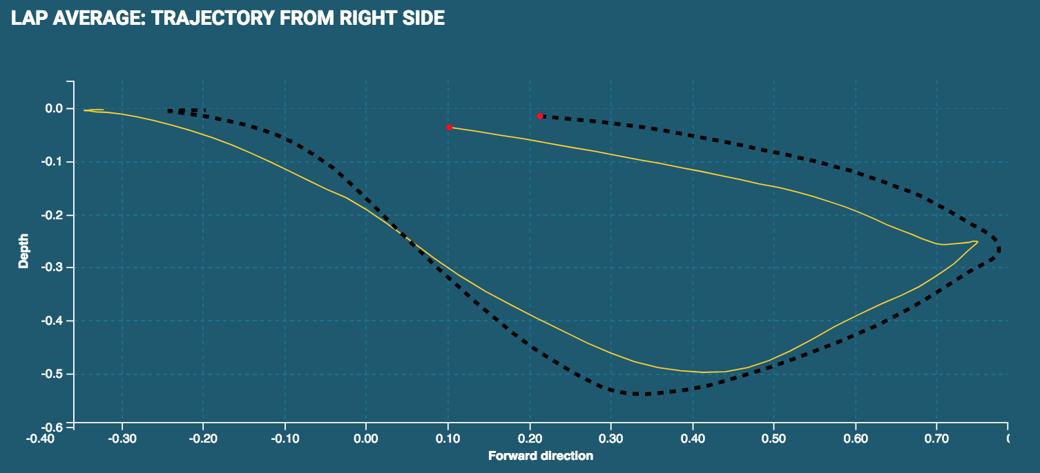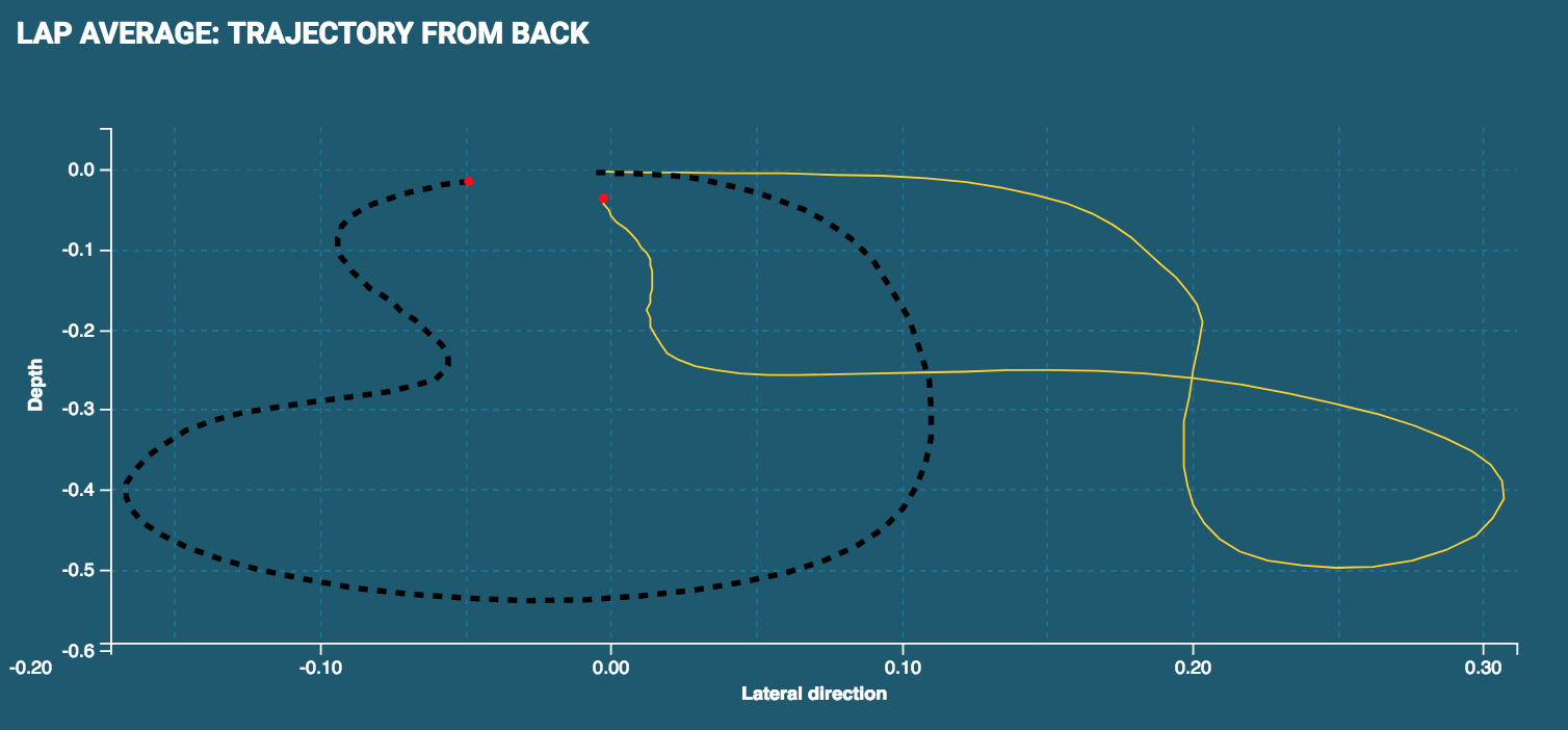 In addition to the force data, the Smartpaddle analysis also provides a general picture of how the hand moves in the water, seen from three perspectives – from above, from the side, and from the back. Adding this insight to the force data makes it possible to pinpoint where in the stroke force is lost, and hence what can be done to improve the force generation. By filming the swim during the SmartPaddle measurements all the necessary information and data is available to take action toward a more efficient swim technique, and faster swimming of course.